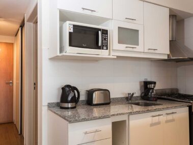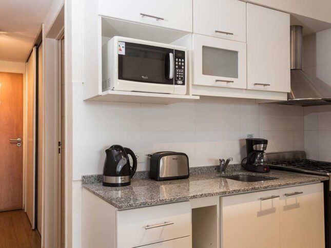 - Cocina a gas totalmente equipada con microondas y heladera, tostador, pava eléctrica