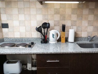 • Cocina eléctrica totalmente equipada, vajilla completa, cafetera y heladera.